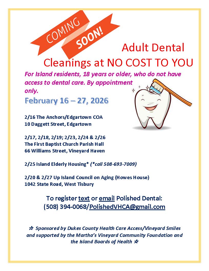 Vineyard Smiles is a program of the Dukes County Health Access Program, provided by Ellen Downing Gould, RDH of Polished Teeth, a Permitted Portable Dental Operatory. MassHealth values adult cleaning and screening at an $80 reimbursement value. Vineyard Smiles is supported by the generosity of the Martha’s Vineyard Community Foundation and the Island Boards of Health.