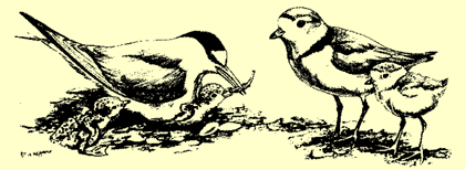 The breeding season for plovers begins in April and continues into August. For least terns the season starts around Memorial Day and continues into August. We protect the nesting habitat by putting up symbolic fencing and signs saying that also have the drawing shown here. Please stay out of the areas posted in this manner.