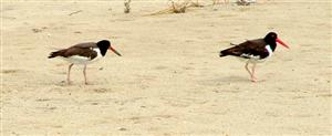 The photograph on the right was taken on Norton Point Beach in 2004. An adult is on the right (with its bright red beak) and a two month old chick is on the left (with a black beak that is beginning to turn red at its base).
