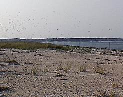 Least tern colonies are not necessarily in the same place year after year. Each of the County managed beaches (Norton Point Beach, Eastville Point Beach and Joseph Sylvia State Beach) has good nesting habitat even though it is not occupied every year. Based on our observations, a colony site is more likely to become abandoned if predators are active within the colony. For example, the nests of the 520 breeding pairs of terns on State Beach in 2002 were wiped out by great black-backed gulls and skunks (within one week of taking the above photo). This site, in the middle of the Oak Bluffs side of the beach, was not used in either 2003 or 2004.